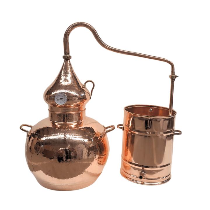 Cazan de Tuica Tip Alambic - 20 Litri | Fabricat Manual din Cupru Pur (99,9%) in Portugalia Acest cazan de tuica de tip Alambic traditional, cu o capacitate de 20 litri, este o piesa autentica de artizanat portughez, fabricat manual de maestri cu experienta transmisa din generatie in generatie. Realizat exclusiv din cupru alimentar de puritate 99,9%, cazanul este destinat pasionatilor de distilare care cauta un echipament compact, eficient si rafinat, ideal pentru obtinerea unor bauturi spirtoase aromate si curate.